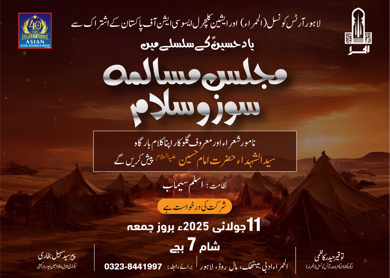لاہور (سہ پہر) لاہور آرٹس کونسل الحمراء اور ایشین کلچرل ایسوسی ایشن آف پاکستان کے اشتراک سے مجلس مسالمہ ، سوزوسلام آج 11 ، جولائی بروز جمعہ کو الحمراء ادبی بیٹھک شاہراہ قائداعظم لاہور شام 7 ۔ بجے منعقد ہو رہی ہے