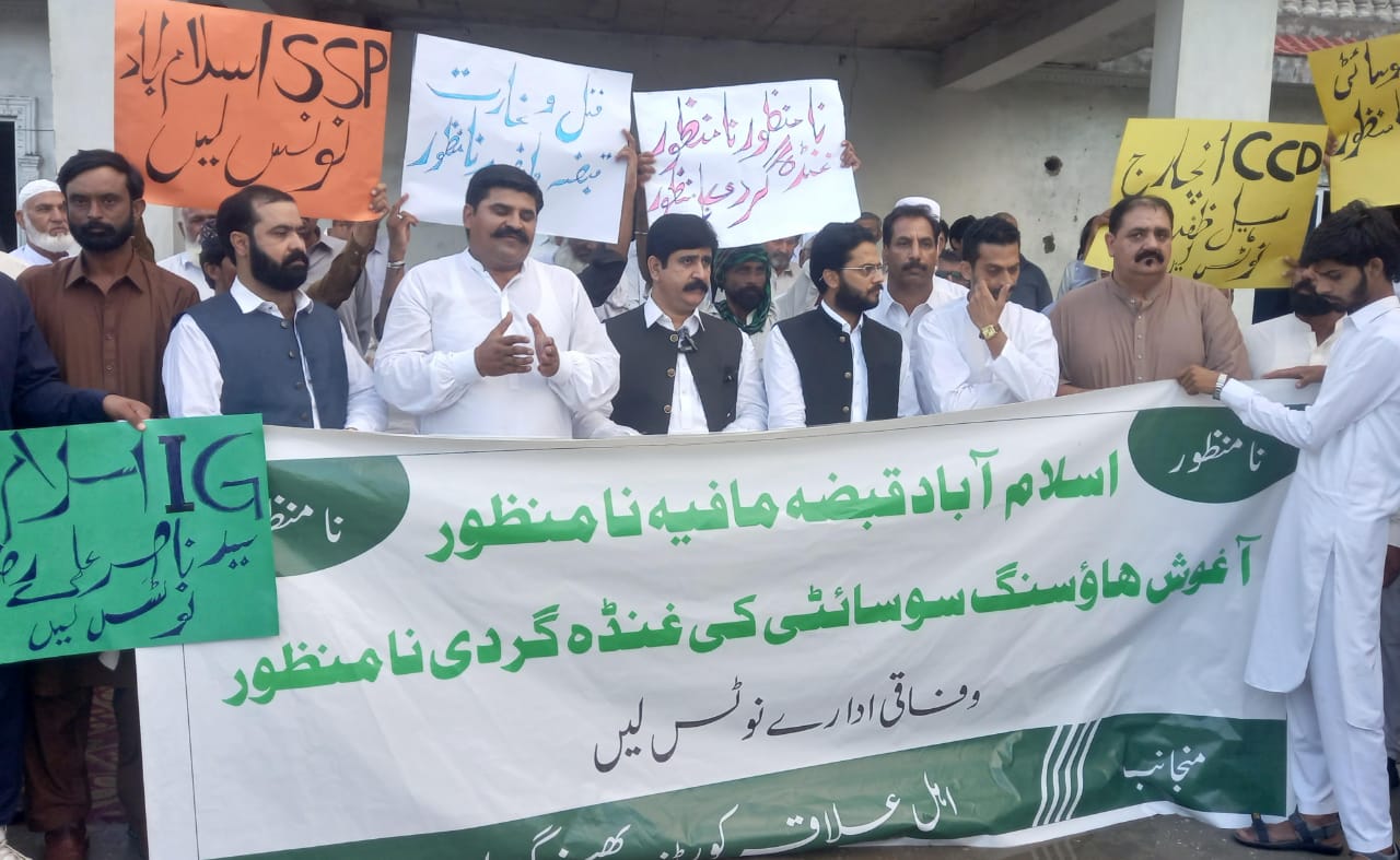 اسلام آباد (سہ پہر)(مظہر شاہ )وفاقی دارالحکومت کے علاقہ تھانہ ہمک کی حدود میں قاٸم نجی ہاوسنگ سوساٸٹی أغوش کے قبضہ مافیا کے خلاف عوام علاقہ اور جدی زمیندار سراپااحتجاج زمینوں پر قبضے نامنظور ناحق قتل نامنظور وفاقی ادارے نوٹس لیں ملک اسرار ودیگر مافیا کے خلاف ہر قانونی کارواٸی کرے گے،راجہ زاہد أذاد أغوش ہاوسنگ سوساٸٹی کی مبینہ ملی بھگت سے تین افراد پہلے ہی ناحق قتل کرواچکے ہیں باقی ماندہ جدی زمینداروں کو بھی دھمکیاں مل رہی ہیں وفاقی وزیرداخلہ أٸی جی اسلام أباد دیگر اعلی احکام سے نوٹس لینے کا مطالبہ عوام علاقہ کی احتجاجی پریس کانفرنس اور بڑے احتجاج کا فیصلہ تفصیلات کے مطابق أغوش ہاوسنگ سوساٸٹی کے قبضہ مافیا نے مقامی زمینداروں پر قبضے کرنا اپنا معمول بنارکھا ہے جس کے خلاف عوام علاقہ اور مقامی جدی زمینداروں پہلے ہی سراپا احتجاج تھے أب بڑے احتجاج ٹی چوک جی ٹی روڈ پر دھرنے کا فیصلہ کرنے کیے گرینڈ جرگہ منعقد کیا گیا اور احتجاجی پریس کانفرنس میں قتل ہونے والے لواحقین نے چٸیرمین وزارت داخلہ امور قاٸمہ کمیٹی راجہ خرم نواز أٸی جی اسلام أباد اور وفاقی دارالحکومت کے وفاقی اداروں سے نوٹس لینے کا مطالبہ کیا