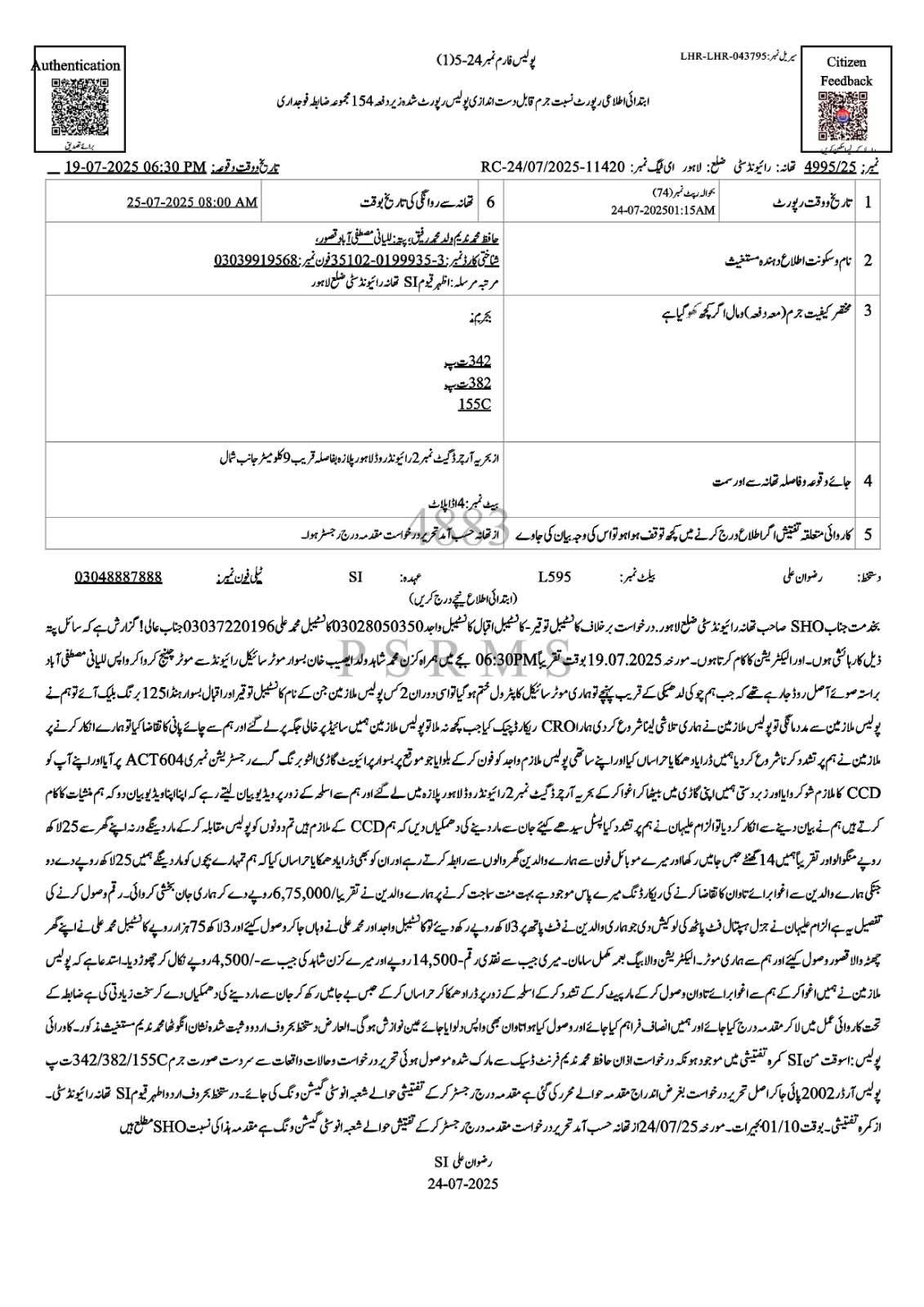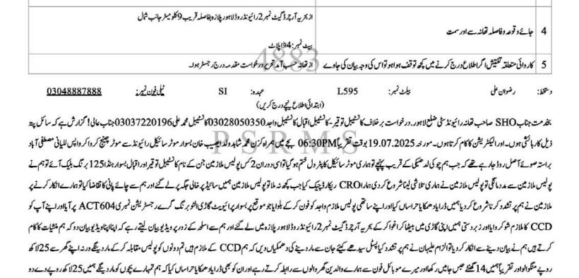 لاہور (سہ پہر) سی سی ڈی کے نام پر ڈرا کر رشوت کا مطالبہ کرنے والے ملازمین کے خلاف اندراج مقدمہ برخلاف ملازمان کانسٹیبل توقیر 17476 ، کانسٹیبل عاقب 17455/سی ، کانسٹیبل محمد علی2441/سی تھانہ رائیونڈ و کانسٹیبل واجد ایس پی یو فاروق آباد