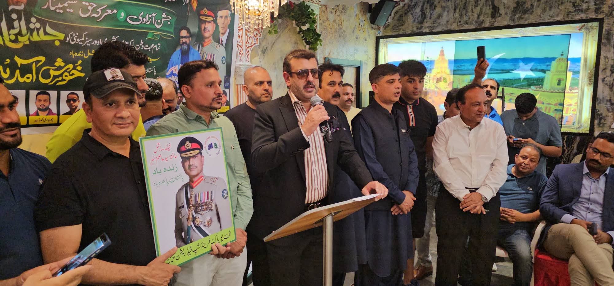 ان خیالات کا اظہار گزشتہ روز ای یو پاک فرینڈ شپ فیڈریشن کے زیر اہتمام جشن آزادی پاکستان سیمنار کا انعقاد ہواتقریب میں چوہدری پرویز اقبال لوہسر چئیرمین ای یو پاک فرینڈ شپ فیڈریشن جبکہ پاکستان قونصلیٹ بارسلونا کی نمائندگی ویلفیئر اتاشی سالک گوندل اور پاکستان پیپلز پارٹی سپین کے سیکر ٹری اطلاعات اقبال گل وحید خٹک کے علاوہ بڑی تعداد میں پاکستانی کمیونٹی نے شرکت کی صدر ای یو پاک فرینڈ شپ کامران خان نے سیٹیچ سیکرٹری کے فرائض شاہد احمد شاہد تلاوت قرآن پاک کی سعادت رضوان کاظمی نے حاصل کی اویس حیدری نے نعتہ کلام پیش کیا سعید حیدری قدیر احمد خان نے ملی نغمے پیش کیے , پاکستان زندہ باد پاک فوج زندہ باد فیلڈ مارشل سید حافظ عاصم منیر زندہ باد کے نعرے اورقومی ترانہ پڑھا گیابلال آحمد شریف ، رضوان کاظمی کی جانب سے گرینڈ جشن آزادی پاکستان کیک سپین ملک حفیظ اعوان ملک نوید اعوان ملک شفیق اعوان. راجہ مدثر اقبال بلانی نے کاٹا اوورسیز کمیونٹی کے عبدالوحید خٹک آفیسر ایمیگریشن قونصلیٹ آفس بارسلونا ، محمد اقبال چوہدری ، کامران خان ، خالد شہباز چوہان، سید عبدالقادر گیلانی، اور چوہدری پرویز اقبال لوہسر چئیرمین ای یو پاک فرینڈ شپ فیڈریشن نے بھی خطاب کیا
