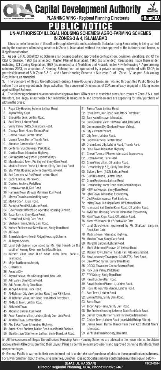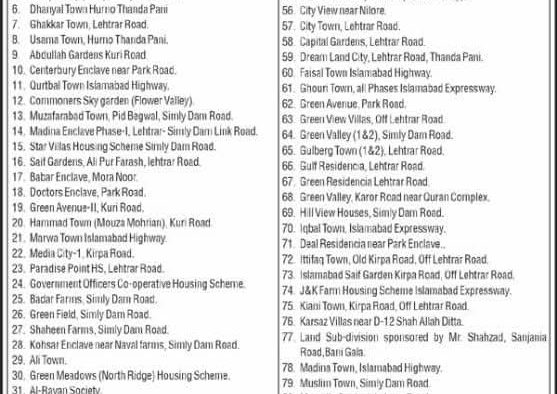اسلام آباد (سہ پہر) سی ڈی اے نے اسلام آباد کی 99ویں ہاؤسنگ سوسائٹیز کو غیر قانونی قرار دیدیا، متعلقہ سوسائٹیز کے اسپانسرز اور مالکان کا نام ای سی ایل میں ڈالنے کا فیصلہ