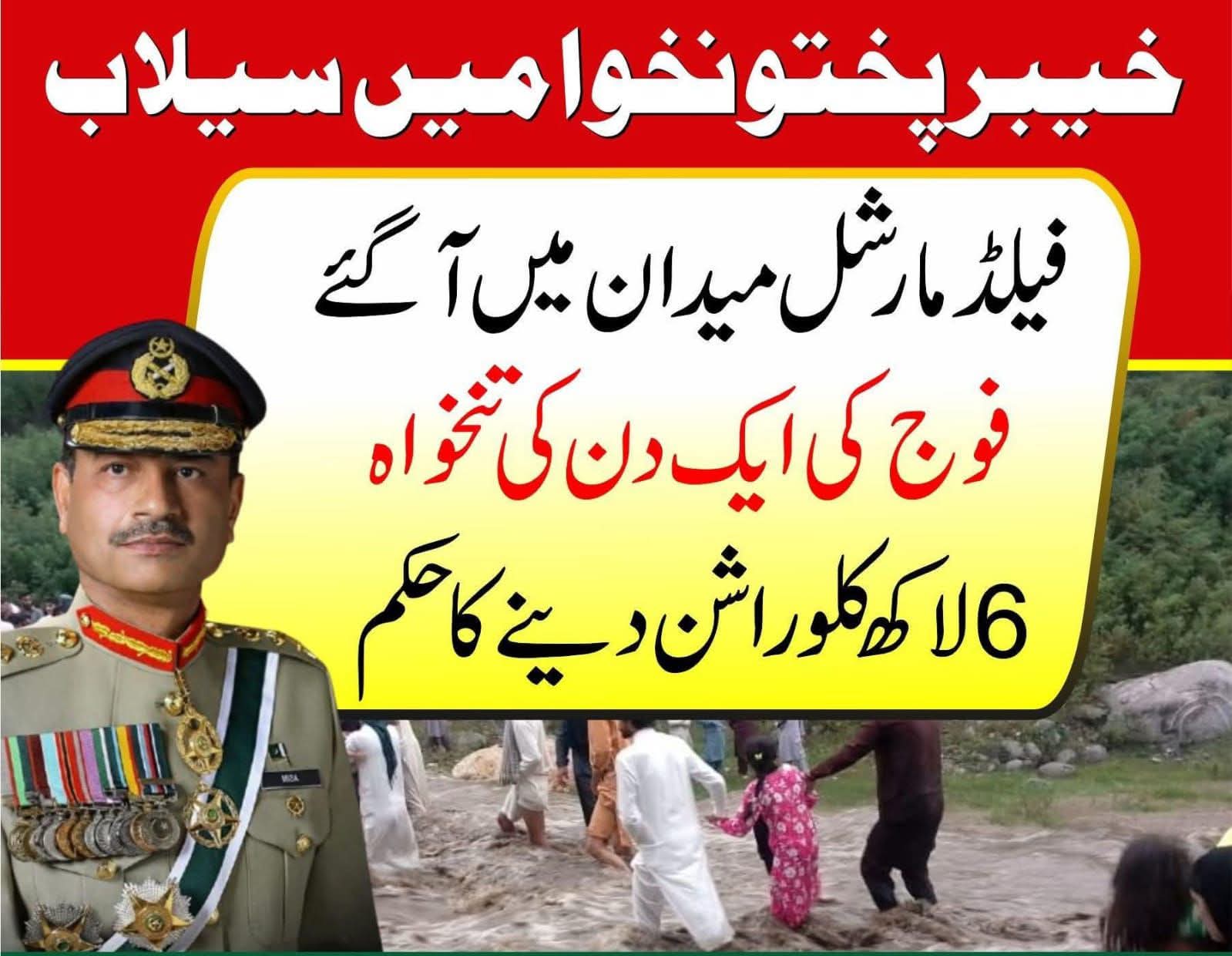 راولپنڈی (سہ پہر) خیبر پختونخوا میں سیلاب، فیلڈ مارشل میدان میں آگئے، فوج کی ایک دن کی تنخواہ، 600 ٹن (6 لاکھ کلو) راشن دینے کا حکم