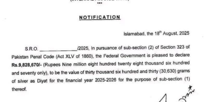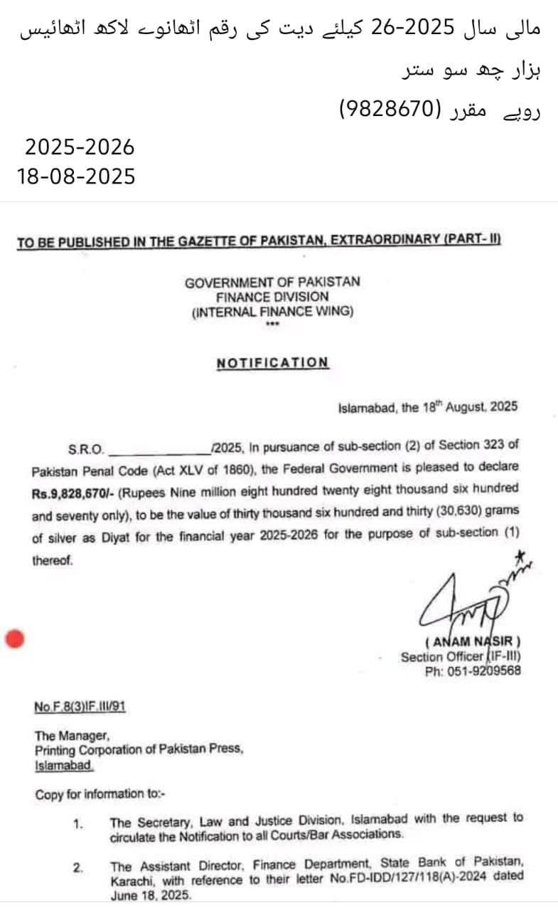 اسلام آباد (سہ پہر) وفاقی حکومت نے سال 2025+26 کے لئے دیت(خون بہا) کی رقم کا تعین کر دیا ۔