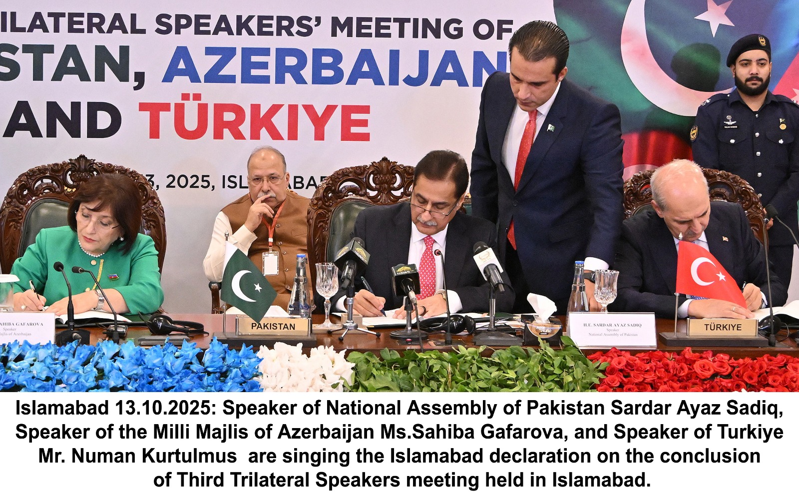 اسلام آباد (سہ پہر) پاکستان، ترکیہ اور آذربائیجان کے اسپیکرز کا تیسرا سہ فریقی اجلاس اختتام پذیر اسلام آباد اعلامیہ” میں علاقائی امن، سلامتی اور خوشحالی کے فروغ کے عزم کا اعادہ