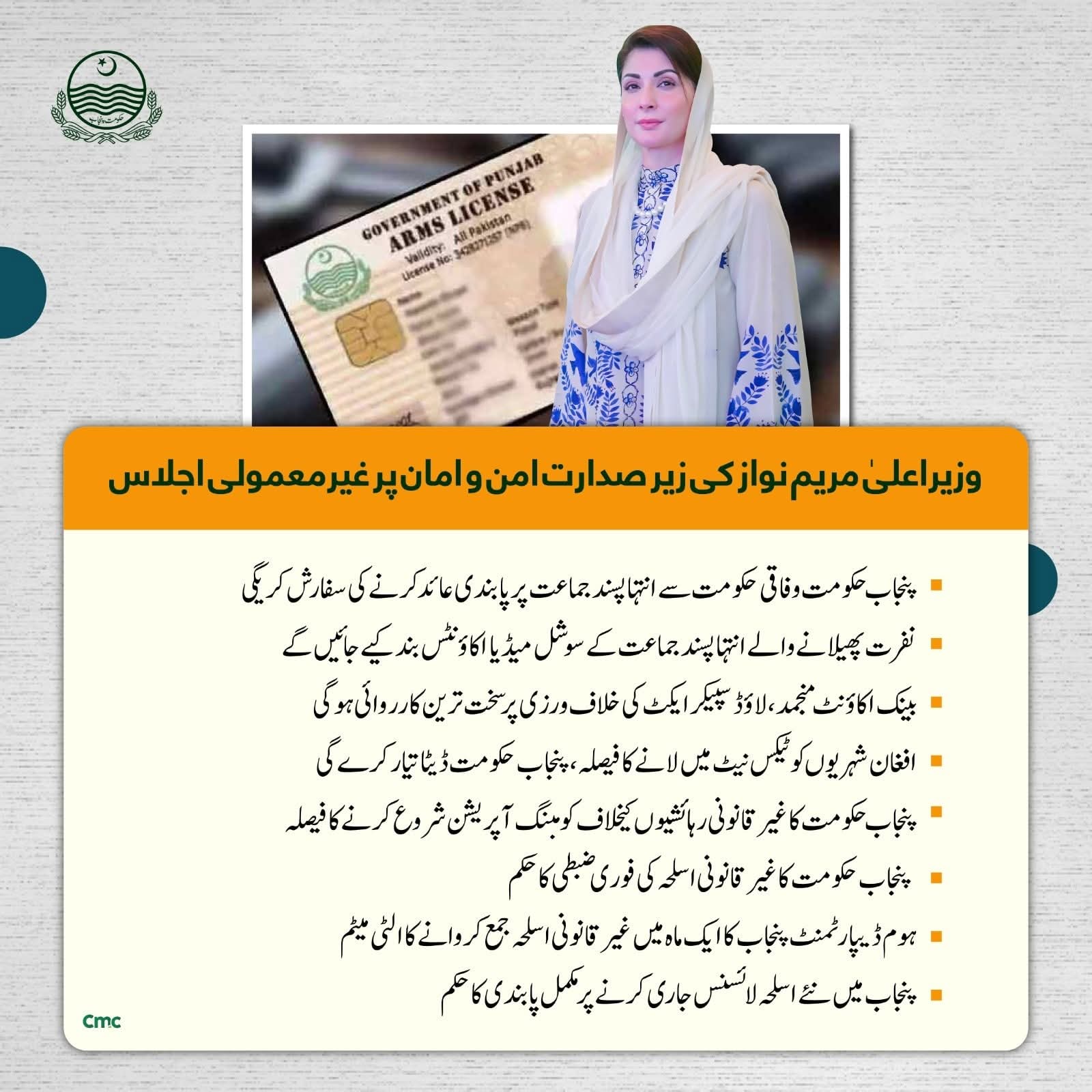 راولپنڈی (سہ پہر) وزیر اعلیٰ مریم نواز کی زیر صدارت اجلاس میں انتہا پسند جماعت پر پابندی کی سفارش، نفرت انگیز سوشل میڈیا اکاؤنٹس کی بندش، غیر قانونی اسلحہ ضبط کرنے اور نئے لائسنس پر پابندی کا فیصلہ کیا گیا۔ افغان شہریوں کو ٹیکس نیٹ میں لانے اور غیر قانونی رہائشیوں کیخلاف کومبنگ آپریشن کا بھی اعلان کیا گیا۔