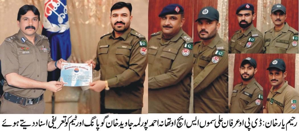 رحیم یارخان (سہ پہر)/ کامیاب پولیس مقابلہ پر ڈی پی او عرفان علی سموں کا ایس ایچ او احمد پور لمہ جاوید خان گوپانگ اور ٹیم کو 1 لاکھ روپے نقد انعام تعریفی اسناد سے بھی نوازا