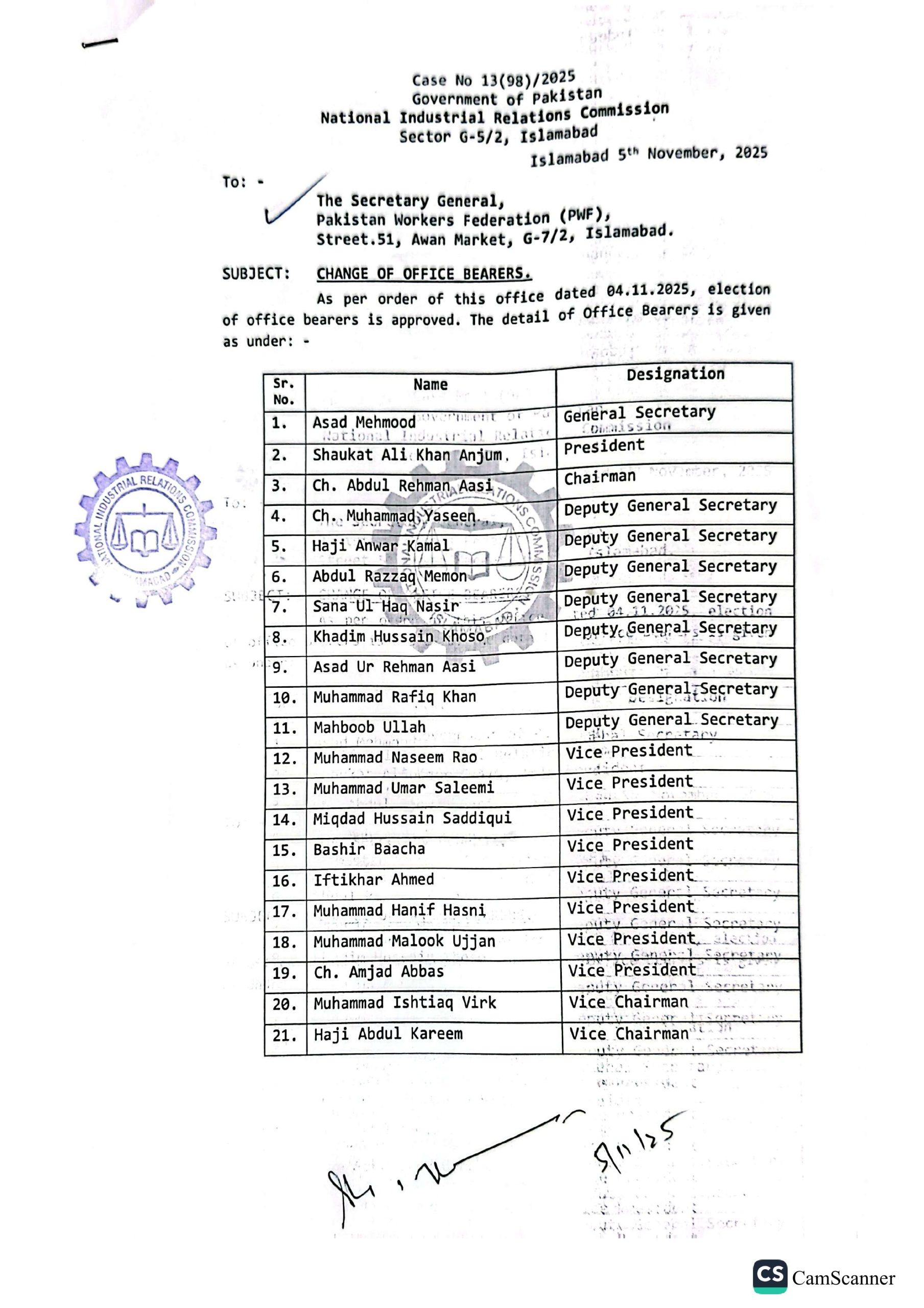 اسلام آباد (سہ پہر) پاکستان ورکرز فیڈریشن کے انتخابات کی این آئی آر سی نے باقاعدہ منظوری دے دی، نوٹیفکیشن جاری