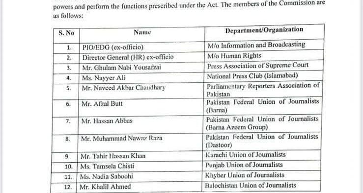 وفاقی حکومت نے 14 نومبر 2025 کو صحافیوں کے تحفظ اور میڈیا پروفیشنلز کے بنیادی و قانونی حقوق کے مؤثر تحفظ کو یقینی بنانے کے لیے ’تحفظِ صحافی و میڈیا پروفیشنلز ایکٹ 2021‘ کے تحت ایک آزاد کمیشن کے قیام کا نوٹیفکیشن جاری کر دیا ہے۔ نئے قائم شدہ کمیشن میں وزارتِ اطلاعات، وزارتِ انسانی حقوق اور قومی و صوبائی صحافتی تنظیموں کے نامزد نمائندے شامل ہوں گے جنہیں صحافیوں کے خلاف تشدد، دھمکیوں، ہراسگی، جبری گمشدگی، پابندیٔ اظہار اور پیشہ ورانہ فرائض میں رکاوٹ جیسے سنگین معاملات کی نگرانی، انکوائری اور فوری حل کے اختیارات تفویض کیے گئے ہیں۔ یہ کمیشن میڈیا پروفیشنلز کے حقوق کے تحفظ، رپورٹنگ کے دوران پیش آنے والے خطرات کے سدباب، متاثرہ صحافیوں کو قانونی معاونت کی فراہمی اور ذمہ داران کے خلاف کارروائی کی سفارشات تیار کرے گا۔ کمیشن کے قیام کو ملک میں آزادیٔ اظہار، صحافتی آزادی اور محفوظ صحافت کے فروغ کے لیے اہم سنگ میل قرار دیا جا رہا ہے، جب کہ صحافتی تنظیموں نے امید ظاہر کی ہے کہ اس اقدام سے صحافیوں کے خلاف جرائم کی روک تھام اور ان کے تحفظ کے نظام میں عملی بہتری آئے گی