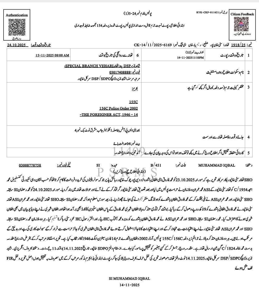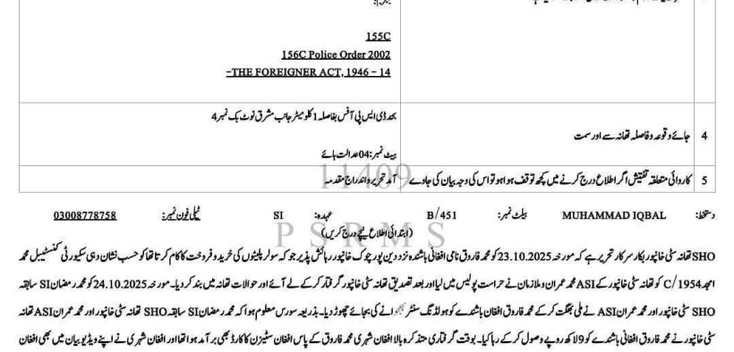 گجرانوالہ (سہ پہر) 10 ہزار روپے انعام کے لیے افغانی شہری پکڑوانے والے شہری کو پولیس نے انعام دینے کے بجائے افغانی سے ہی 6 لاکھ روپے لے کر چھوڑ دیا