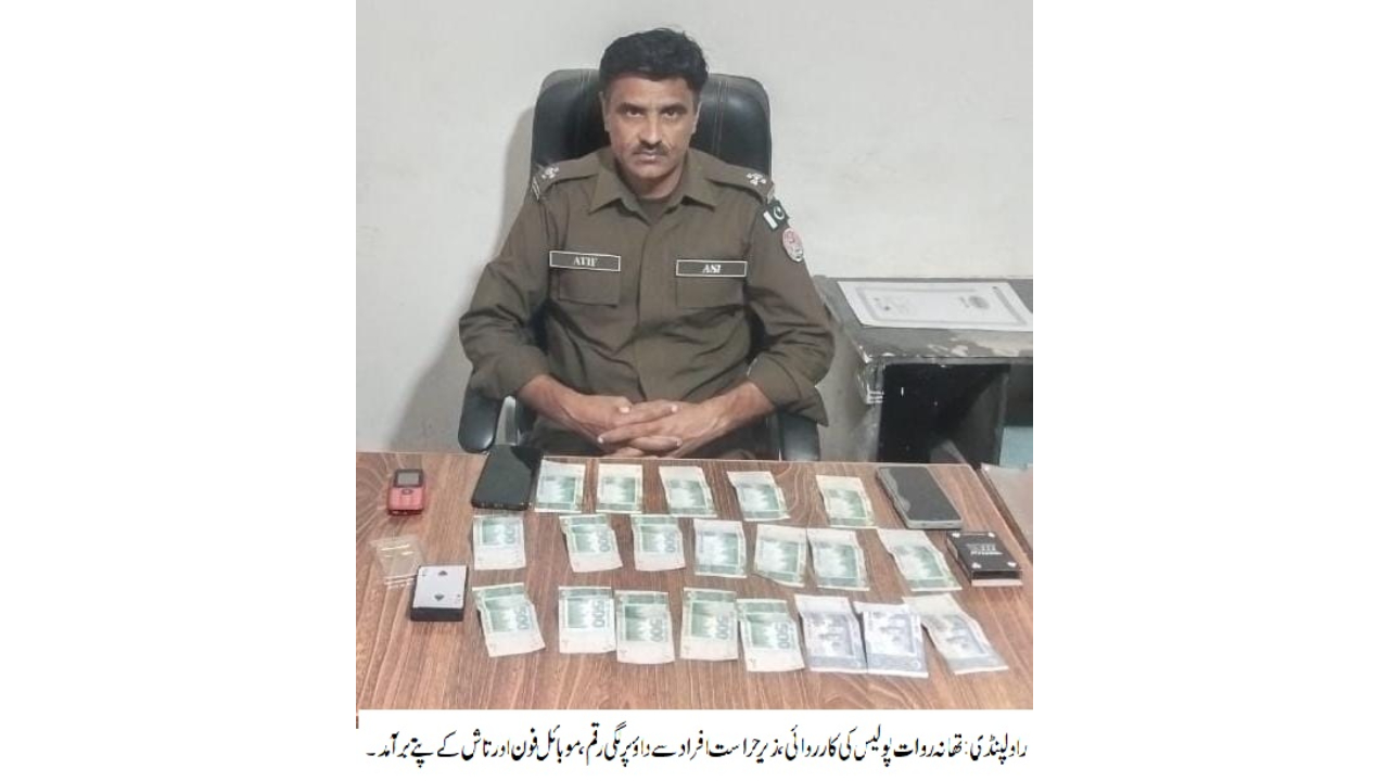 راولپنڈی (سہ پہر)(مظہر شاہ)ایس ایچ او تھانہ روات زاہد ظہور کی سربراہی میں پولیس ٹیم کی کارروائی، تاش کے پتوں پر جواء کھیلنے والے 3 افراد گرفتار،داؤ پر لگی رقم 11 ہزار 500 روپے،3 موبائل فون اور تاش کے پتے برآمد۔تفصیلات کے مطابق تھانہ روات پولیس نے کارروائی کرتے ہوئے تاش کے پتوں پر جواء کھیلنے والے 3 افراد کو گرفتار کرلیا،داؤ پر لگی رقم 11 ہزار 500 روپے،3 موبائل فون اور تاش کے پتے برآمدہوئے،روات پولیس نے مقدمہ درج کرکے گرفتار کرلیا،ایس پی صدر انعم شیر کاکہنا تھا کہ قمار بازی دیگر معاشرتی برائیوں کی جڑ ہے۔