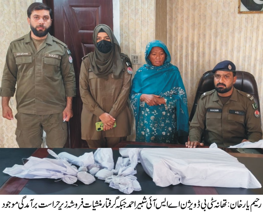 رحیم یارخان (سہ پہر) تھانہ سٹی بی ڈویژن پولیس کی بڑی کارروائی 10 کلو سے زائد چرس برآمد خاتون منشیات فروشہ گرفتار، مقدمہ درج۔ ایس ایچ او تھانہ سٹی بی ڈویژن شکیل احمد اور ٹیم کی ڈی ایس پی سٹی راؤ دلشاد کی نگرانی میں منشیات فروشوں کے خلاف کارروائیاں جاری ہیں، گزشت روز اسسٹنٹ سب انسپکٹر شبیر احمد نے دیگر پولیس پارٹی کے ہمراہ دوران گشت و پڑتال جرائم مخبر سے اطلاع پاتے ہوئے قبرستال دڑی سانگی کے قریب کامیاب چھاپہ مار کارروائی کے دوران عادی و ریکارڈی بدنام خاتون منشیات فروشہ کرم خاتون زوجہ غلام حسین سانگی کو 10 کلو 270 گرام چرس برآمد ہونے پر حسب ضابطہ رنگے ہاتھوں گرفتار کرتے ہوئے مقدمہ درج کر لیا۔