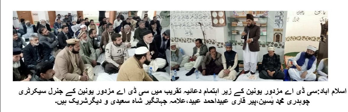 اسلام آباد (سہ پہر) سی ڈی اے مزدور یونین کے زیر اہتمام تنظیم کے فوت ہونے والے درینہ ساتھیوں اور ان کے عزیز واقارب کی روح کے ایصال ثواب کے لیے محفل میلادؐ و دعائیہ تقریب کا انعقاد۔