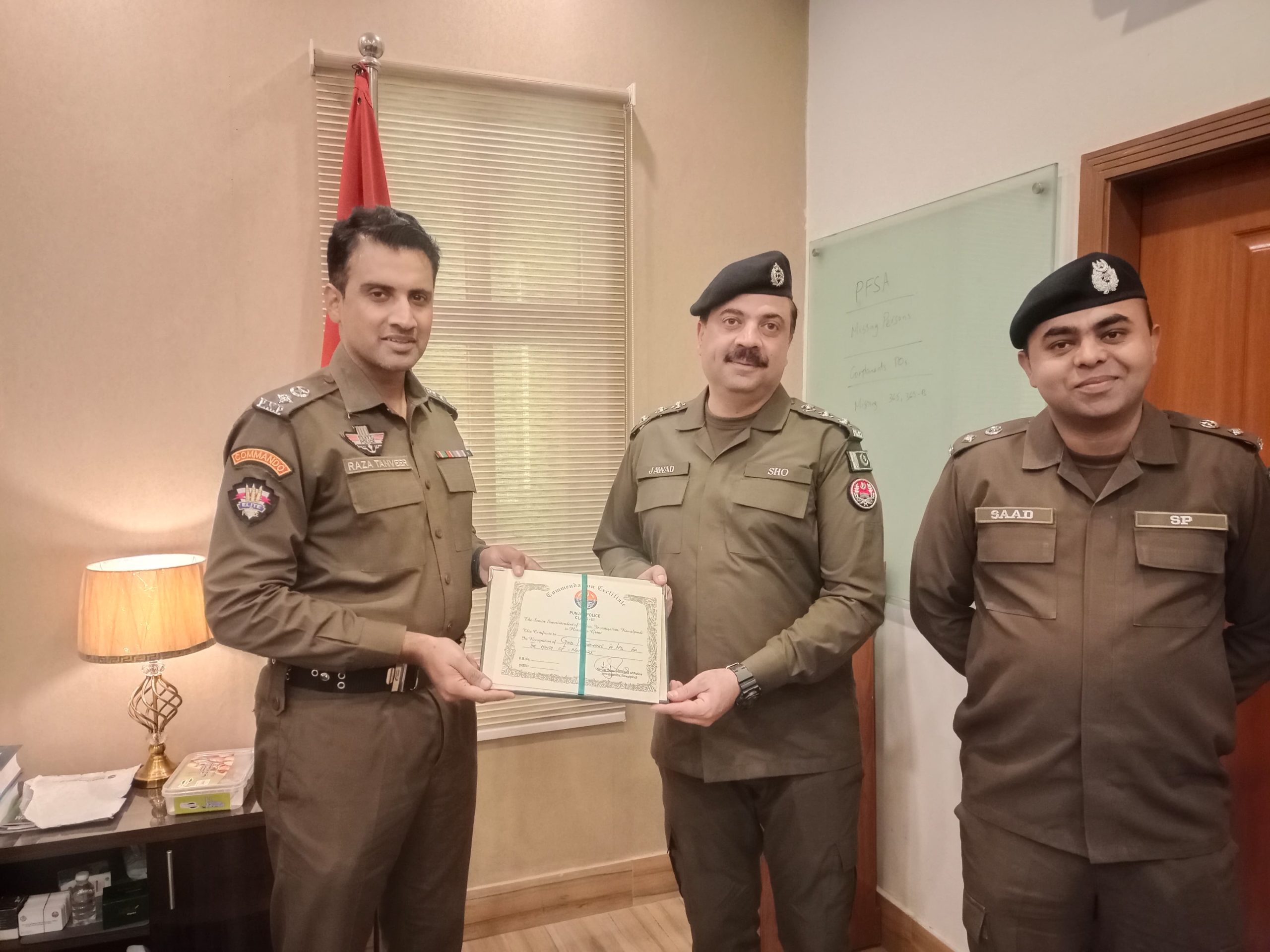 تھانہ رتہ امرال کے ایس ایچ او اسپیکٹر سید جواد حسین شاہ کو بہترین کارکردگی کا ہدف کامیاب کرنے پر سرٹیفکیٹ پیش کیا گیا اس شاندار کارگردگی کے اعتراف میں ایس ایس پی انویسٹیگیشن راولپنڈی ڈاکٹر رضا تنویر نے انہیں تعریفی سرٹیفکیٹ سے نوازا تقریب کے دوران ڈاکٹر رضا تنویر نے کہا اسپیکٹر سید جواد حسین شاہ کی کارگردگی پولیس فورس کی پیشہ روانہ صلاحیت محنت اور عوامی خدمت کے عزم کی بہترین مثال ہے انہوں نے امید ظاہر کی کہ ائندہ بھی اسی جذبے اور لگن کے ساتھ فرض کی کردگی کا معیار برقرار رکھا جائے گا اور اس موقع پر ایس پی راول بھی اس موقع پرموجود تھے اور انہوں نے بھی یہی دورانیہ دہراتے ہوئے کہا کہ ہم تھانہ رتہ کے ایس ایچ او سے بہت مطمئن ہیں