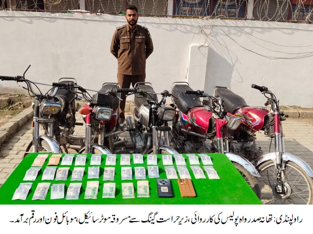 راولپنڈی (سہ پہر) ایس ایچ او تھانہ صدرواہ آفتاب شاہ کی سربراهی میں پولیس ٹیم کی کارروائی، سٹریٹ کرائم اور موٹر سائیکل چوری کے مقدمات میں ملوث دو رکنی گینگ گرفتار، مسروقہ 05 موٹر سائیکل، 02 موبائل فون اور رقم 40 ہزار روپے برآمد۔ تفصیلات کے مطابق تھانہ صدرواہ پولیس نے کارروائی کرتے ہوئے سٹریٹ کرائم اور موٹر سائیکل چوری کے مقدمات میں ملوث دو رکنی گینگ کو گرفتار کر لیا، زیر حراست گینگ سے مسروقہ 05 موٹر سائیکل، 02 موبائل فون اور رقم 40 ہزار روپے برآمد ہوئی، ایس پی پوٹھوہار طلحہ ولی کا کہنا تھا کہ زیرحراست گینگ کو ٹھوس شواہد کے ساتھ چالان عدالت کیا جائے گا، شہریوں کو انکے قیمتی اثاثہ سے محروم کرنے والے افراد قانون کی گرفت سے نہیں بچ سکتے۔