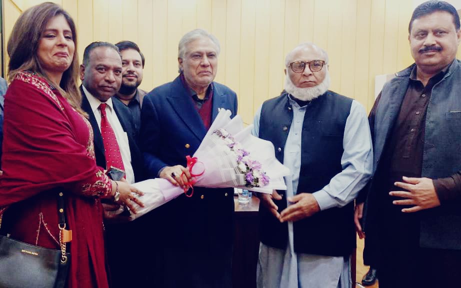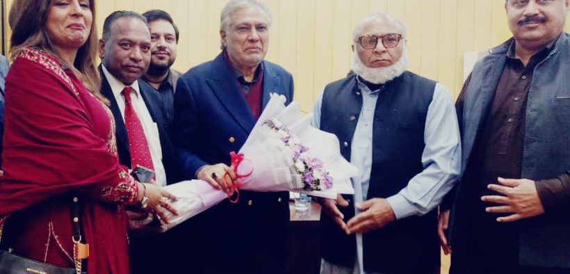 Islamabad (Sapeher Times); Deputy Prime Minister and Foreign Minister Muhammad Ishaq Dar is being presented with a bouquet by Diplomatic Correspondents Forum Pakistan officials Asghar Ali Mubarak, Pervez Mughal, Naseem Ul Ghani, Secretary of Asghar Ali Mubarak National Press Club Islamabad, Ms. Nayyar Ali and others at the Foreign Office Islamabad for successful diplomatic services .