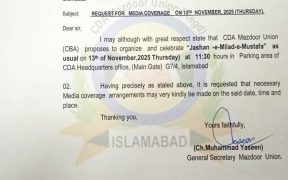 اسلام آباد (سہ پہر) سی ڈ ی اے مزدور یونین(سی بی اے)چوہدری محمد یٰسین گروپ کے زیر اہتمام سالانہ تاجدارختم نبوتؐ کانفرنس ومحفل میلاد مورخہ13نومبربروزجمعرات بوقت دن 10بجے چیئرمین آفس کمپلیکس جی-7/4میں منعقد ہو گی جس کی صدارت صاحبزادہ حق خطیب حسین علی بادشاہ سرکار بلاوڑہ شریف کریں گے،کانفرنس میں معروف مذہبی وسماجی شخصیت الحاج […]
