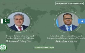 اسلام آباد (سہ پہر) پاکستان نے صومالیہ کی خود مختاری اور علاقائی سالمیت کی مکمل حمایت کا اعادہ کیا ہے۔ترجمان دفتر خارجہ کے مطابق نائب وزیراعظم و وزیر خارجہ اسحاق ڈار کا صومالیہ کے وزیر خارجہ عبدالسلام سے ٹیلیفونک رابطہ ہوا ہے۔ اسحاق ڈار نے صومالیہ کی خودمختاری اور علاقائی سالمیت کے لیے پاکستان کی […]
